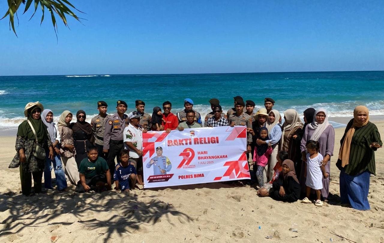 Memperingati Hari Bhayangkara ke-79 Polres Bima Polda NTB melalui Satuan Samaptanya menggelar kegiatan Bhakti Sosial membersihkan Pantai Wane yang terletak di Desa Tolotangga Kecamatan Monta Kabupaten Bima.Kamis (19/6/25) pagi.